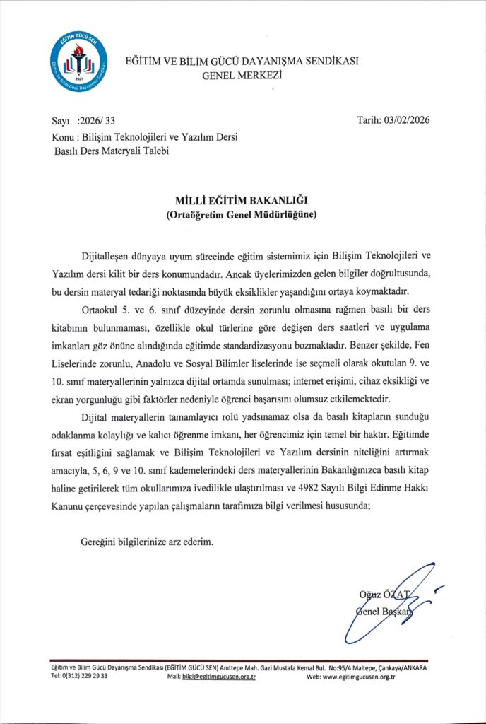 Millî Eğitim Bakanlığı tarafından belirlenen öğretim programları kapsamında okutulan Bilişim Teknolojileri ve Yazılım dersi, dijitalleşen dünyaya uyum sürecinde eğitim sistemimiz açısından kilit bir ders konumundadır. Ancak üyelerimizden gelen bilgiler doğrultusunda, söz konusu dersin ders materyallerinin temini noktasında önemli eksiklikler yaşandığı tespit edilmiştir.