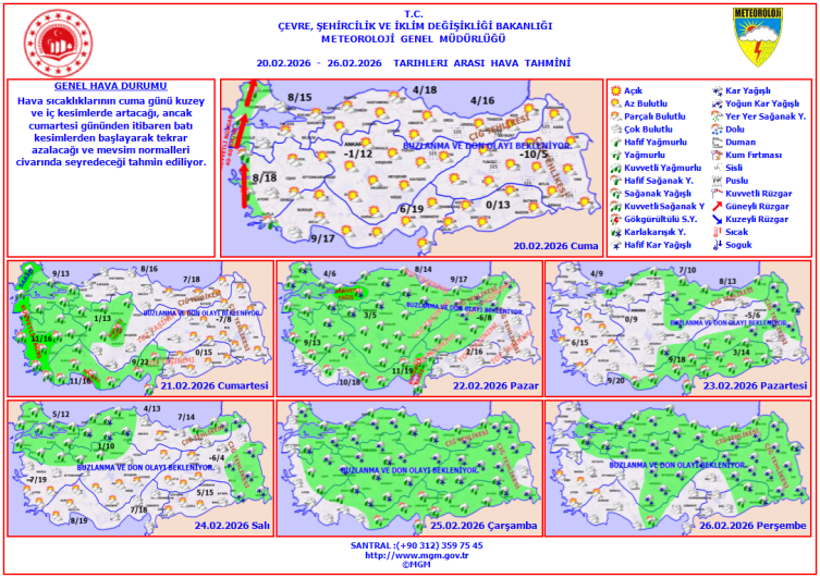 İç Anadolu’nun kuzeyi (Eskişehir, Ankara, Çankırı çevresi), Batı Karadeniz’in iç kesimleri ve Doğu Anadolu’nun yükseklerinde yağışların yer yer karla karışık yağmur ve kar şeklinde olması tahmin ediliyor.