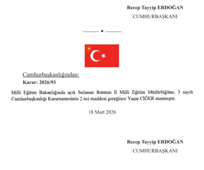 Cumhurbaşkanı Recep Tayyip Erdoğan’ın imzasıyla yayımlanan Resmi Gazete’deki atama kararları ile Batman İl Milli Eğitim Müdürlüğü görevine Yaşar Ciğer asaleten atandı.