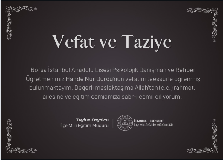 İstanbul Esenyurt Borsa Anadolu Lisesi’nde rehber öğretmen olarak görev yapan Hande Nur Durdu, amansız hastalığa karşı verdiği mücadeleyi kaybetti.