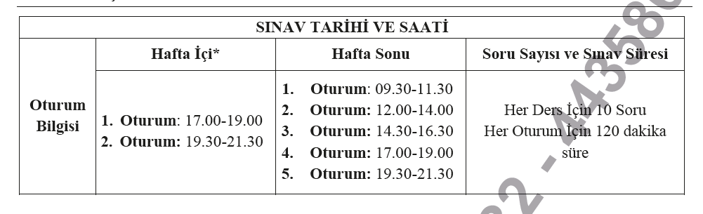 Soru Sayısı ve Sınav Süresi: Her dersten 10 soru sorulacak olup her bir oturum için 120 dakika süre
