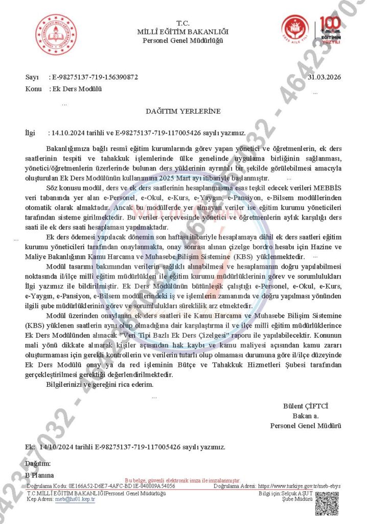 Bakanlığımıza bağlı resmî eğitim kurumlarında görev yapan yönetici ve öğretmenlerin, ek ders saatlerinin tespiti ve tahakkuk işlemlerinde ülke genelinde uygulama birliğinin sağlanması, yönetici/öğretmenlerin üzerlerinde bulunan ders yüklerinin ayrıntılı bir şekilde görülebilmesi amacıyla oluşturulan Ek Ders Modülünün kullanımına 2025 Mart ayı itibariyle başlanmıştır.