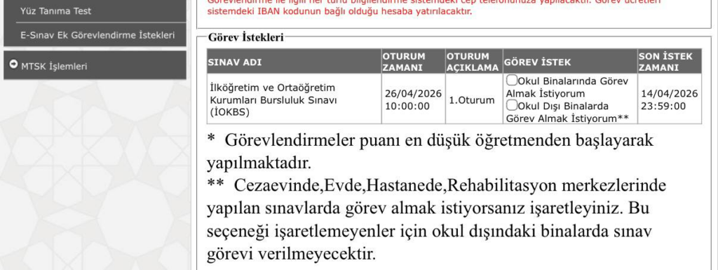 26 Nisan 2026 tarihinde yapılacak olan İlköğretim ve Ortaöğretim Kurumları Bursluluk Sınavı(İOKBS) İçin Sınav Görev Talep Ekranı Açıldı.