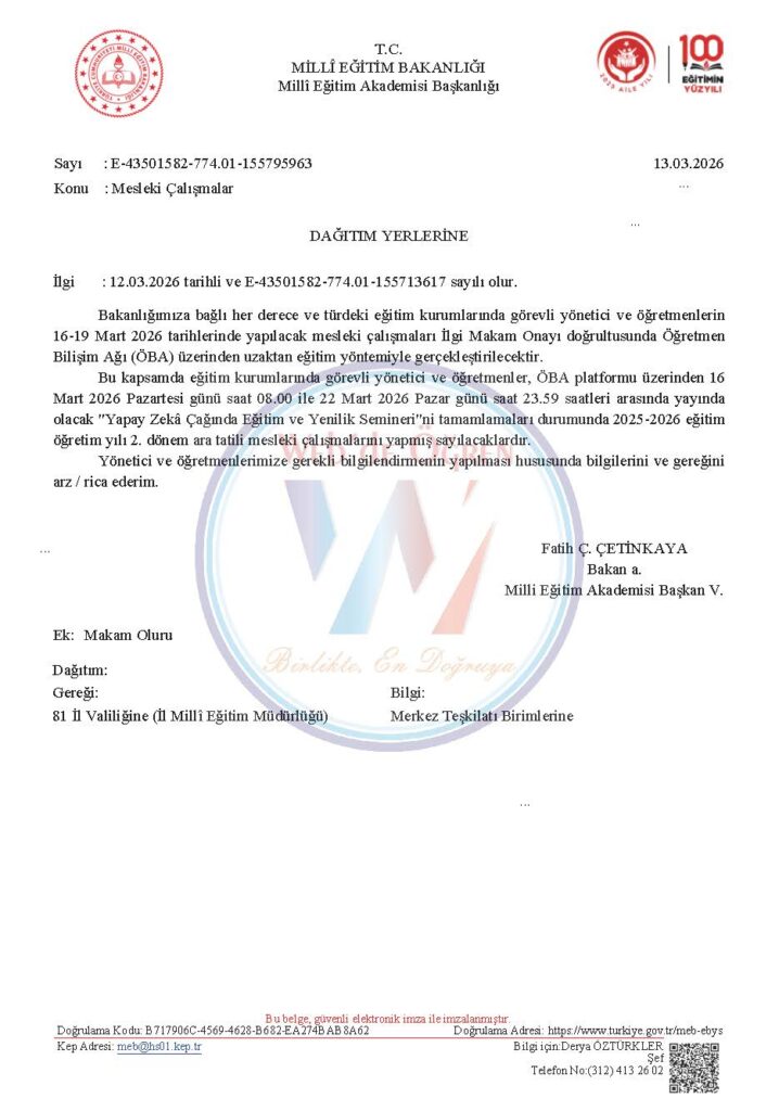 Mesleki Çalışma (Seminer): ÖBA platformu üzerinden 16 Mart 2026 Pazartesi günü saat 08.00 ile 22 Mart 2026 Pazar günü saat 23.59 saatleri arasında yayında olacak “Yapay Zekâ Çağında Eğitim ve Yenilik Semineri” ni tamamlamaları durumunda 2025-2026 eğitim öğretim yılı 2. dönem ara tatili mesleki çalışmalarını yapmış sayılacaklardır.