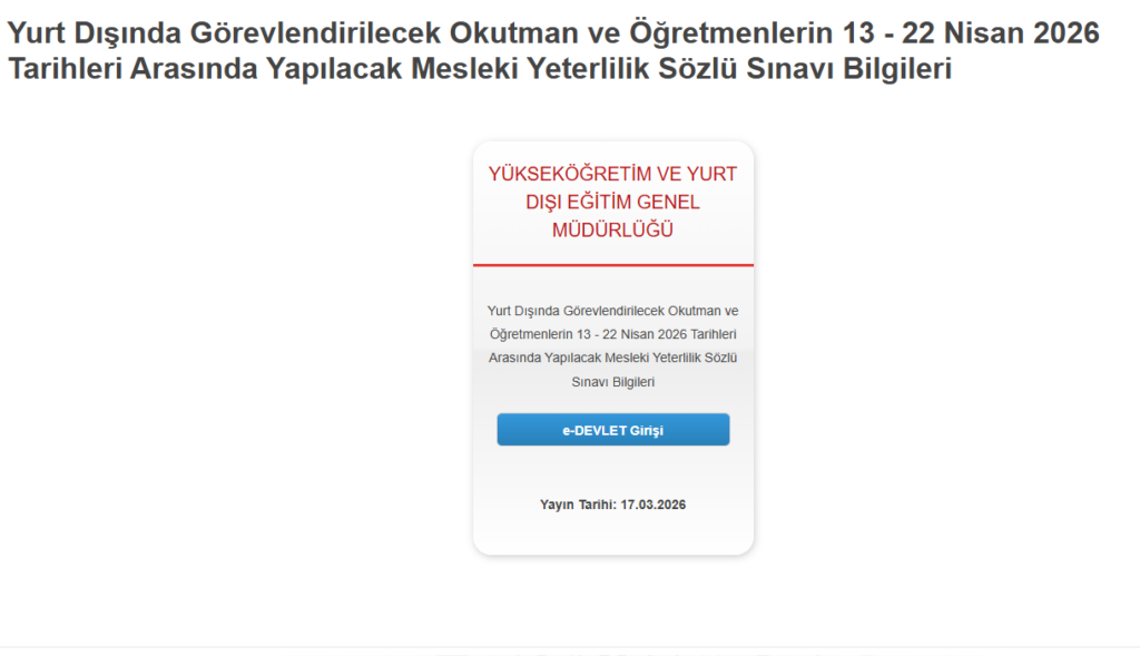 Yurt Dışında Görevlendirilecek Okutman ve Öğretmenlerin 13 – 22 Nisan 2026 Tarihleri Arasında Yapılacak Mesleki Yeterlilik Sözlü Sınavı Bilgileri yayınlandı.